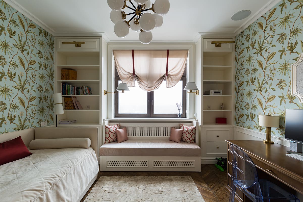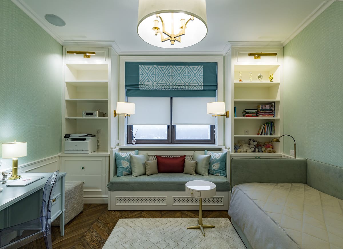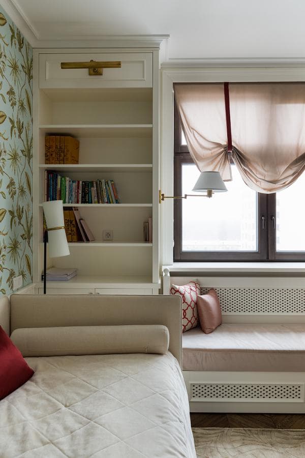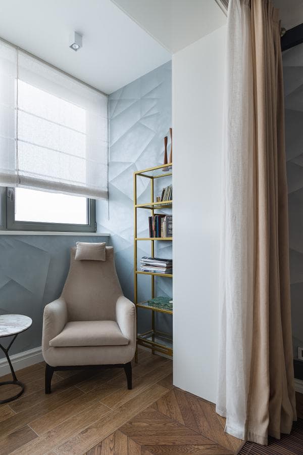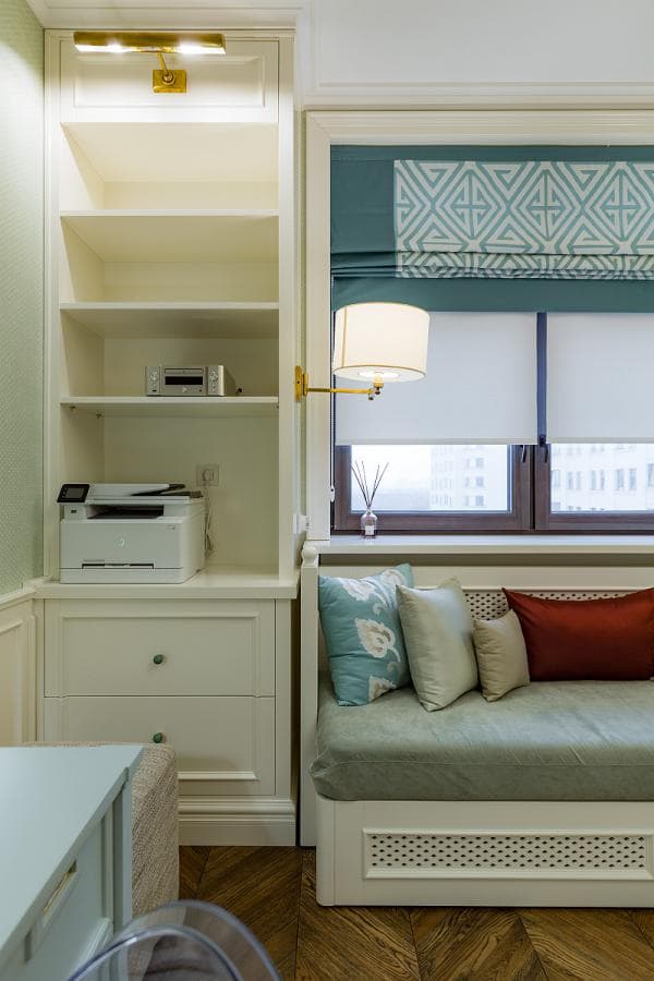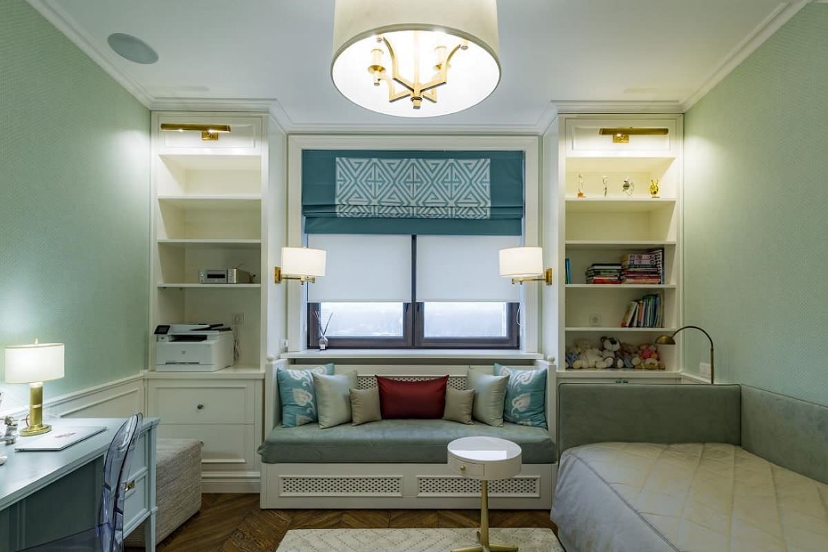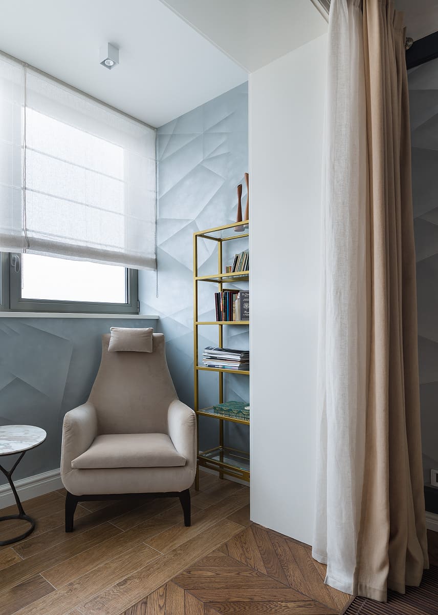 Работу над этим объектом можно описать одной фразой: мы долго и целеустремленно подбирали ткани. И по цвету, и по фактуре. Пока они не стали идеально вписываться в интерьер.