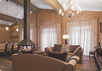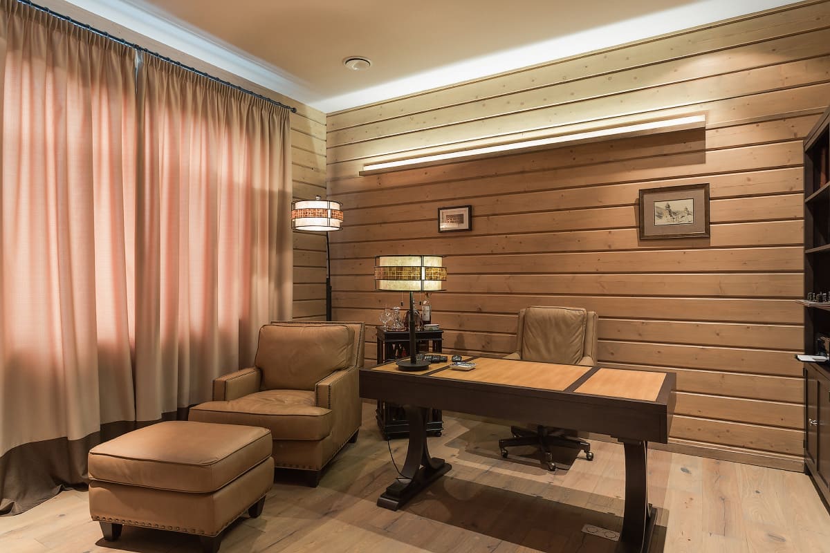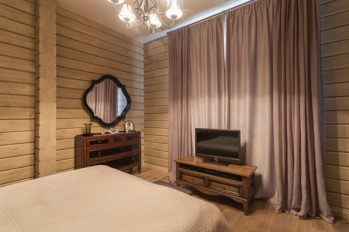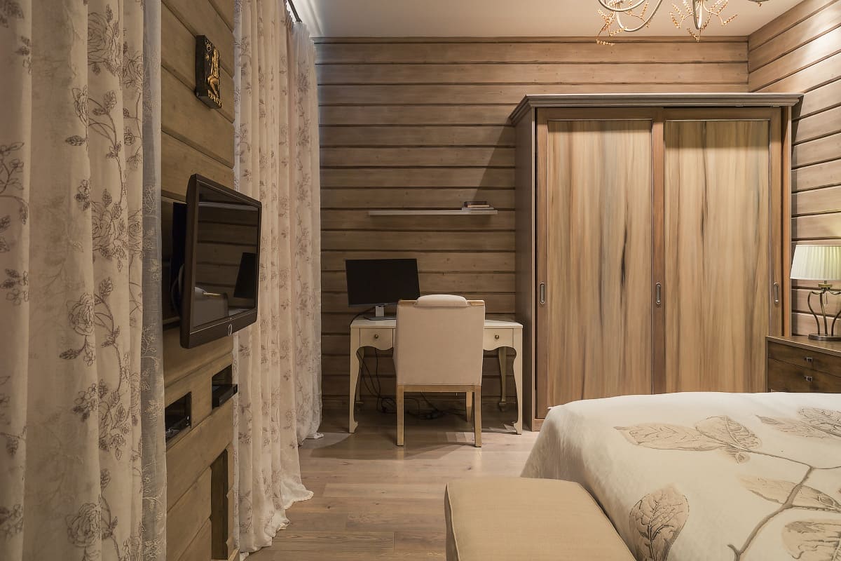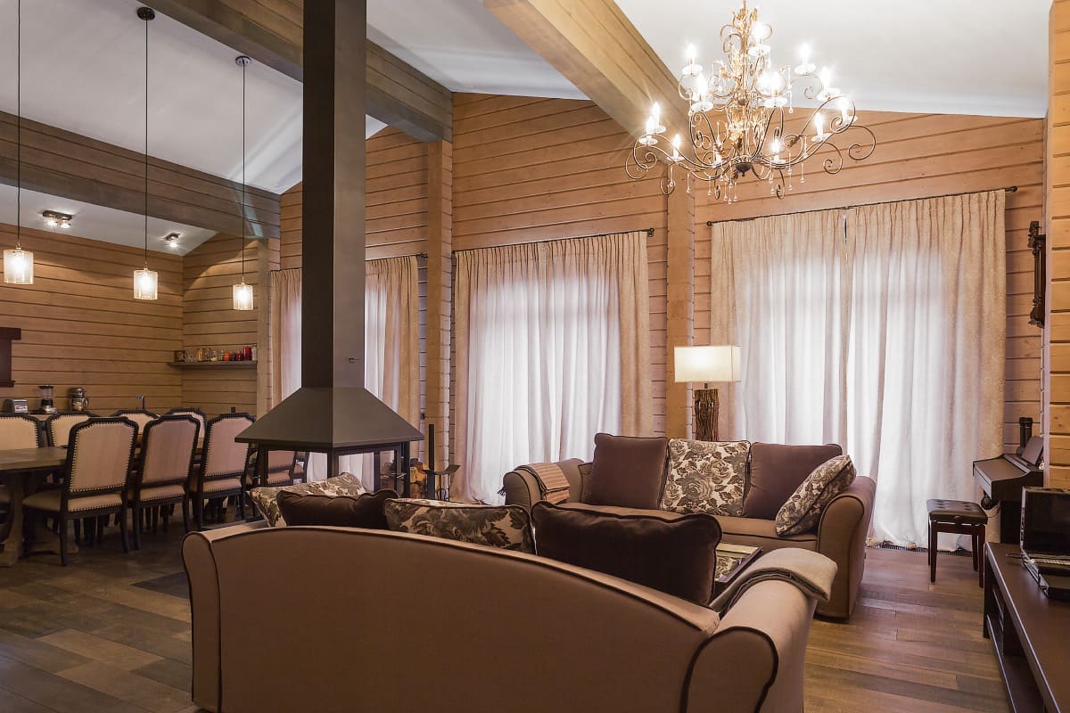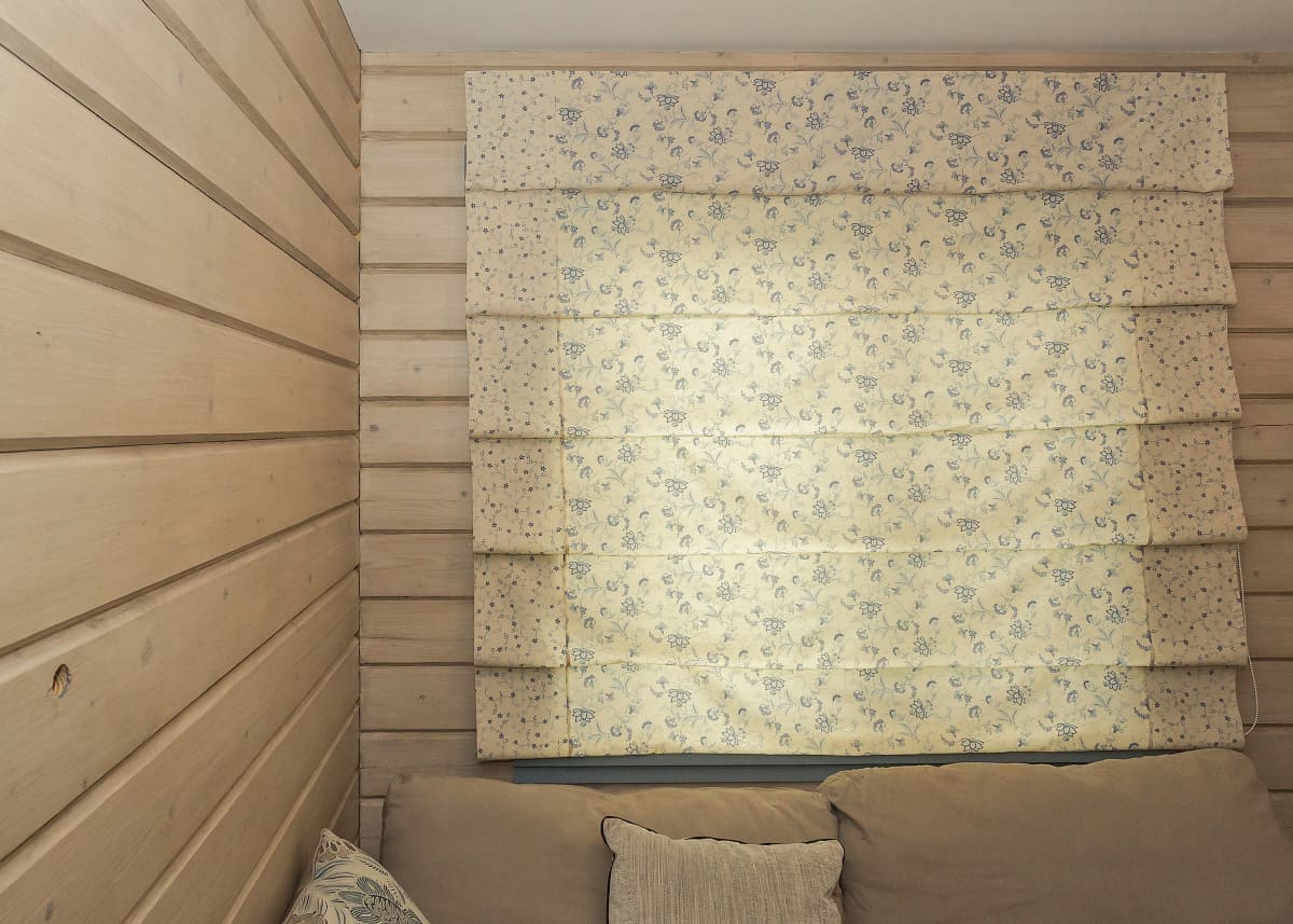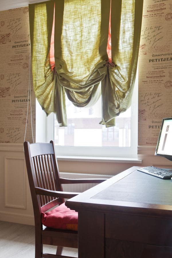 В деревянный дом так и просятся шторы из натуральных тканей. Поэтому для большинства комнат мы предложили именно такие, причем в теплых тонах, подчеркивающих красоту дерева.