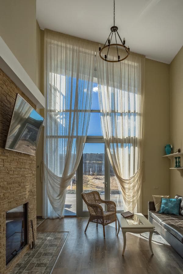 Что касается декоративные карнизы, то их мы подбирали под люстры. Заказчикам хотелось простоты, тепла и уюта в этом доме, который можно смело назвать «экодомом». Нам кажется мы смогли создать нашими шторами именно такую атмосферу. На видео можно посмотреть, как мы делали шторы для самого большого окна в доме.