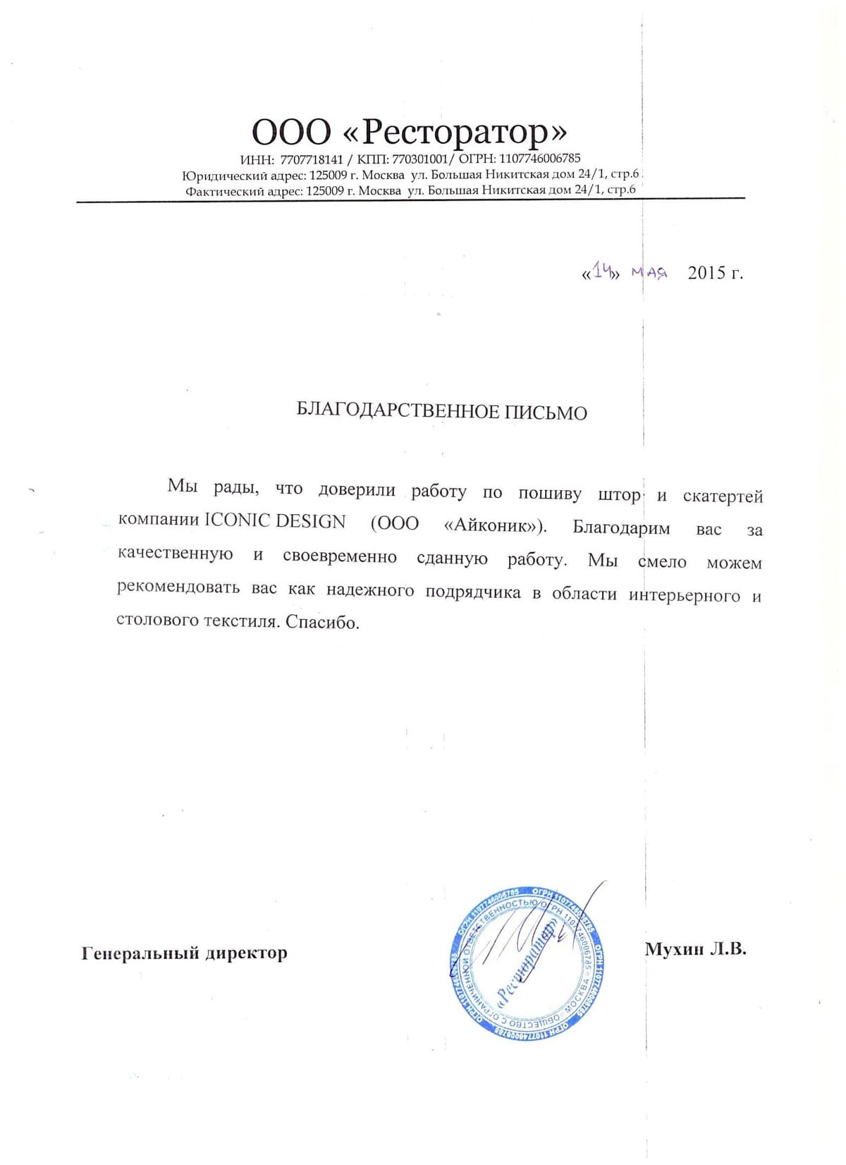Мы рады, что доверили работу по пошиву штор и скатертей компании ICONIC. Благодарим вас за качественную и своевременно сданную работу. Мы смело можем рекомендовать вас как надежного подрядчика в области интерьерного и столового текстиля. Спасибо…